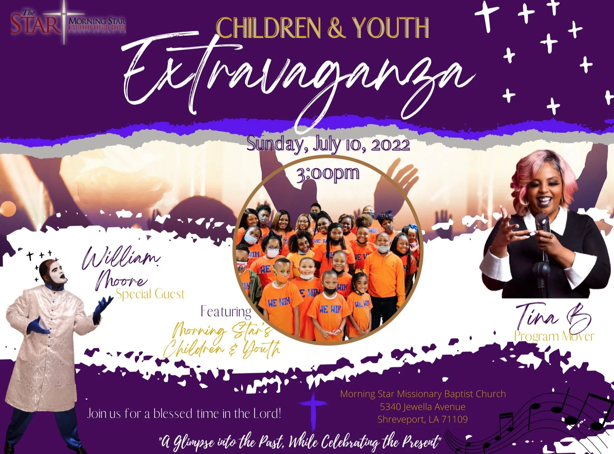 Morning Star Missionary Baptist Church (map) 5340 Jewella Ave Shreveport, LA, 71109 United States ✚ gCal ✚ iCal Don't miss our Extravaganza! Featuring our children and youth…with special guest…William Moore...Sunday July 10th at 3pm.