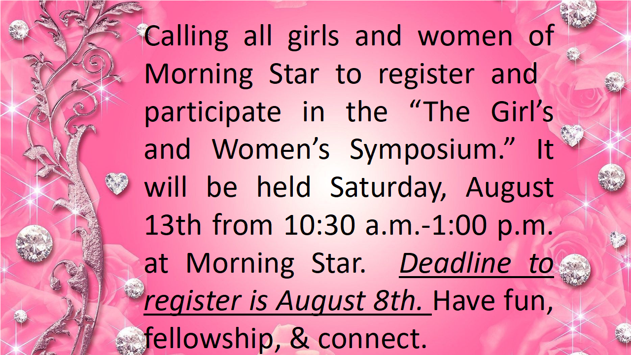 Calling all girls and women of Morning Star to register and participate in the “The Girl’s and Women’s Symposium.” It will be held Saturday, August 13th from 10:30 a.m.-1:00 p.m. at Morning Star. Deadline to register is August 8th. Have fun, fellowship, & connect.
